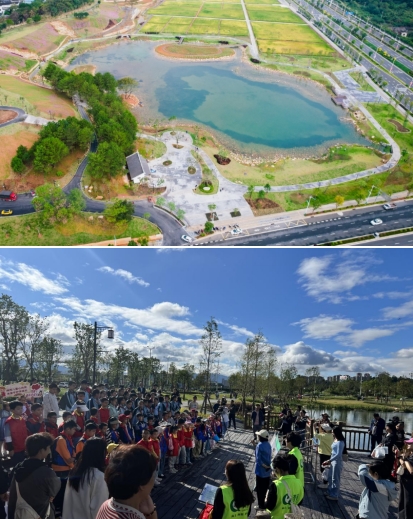 龍州濕地是九龍江流域山水林田湖草沙一體化保護(hù)和修復(fù)項目海綿城市建設(shè)范例工程,也是我市2023年十大重點攻堅項目北部新城建設(shè)的“點睛之筆”,主要使用的是國家政策補(bǔ)助資金。項目占地面積約20公頃,通過“護(hù)山、理水、營林、興田、清湖、豐草”六大舉措,構(gòu)建了蓄洪湖區(qū)、生態(tài)修復(fù)區(qū)、農(nóng)田區(qū)及休閑區(qū)多樣用地,同時設(shè)置了蓄洪湖、濕地步道、山谷攔蓄、引水工程等海綿設(shè)施,實現(xiàn)“城在田中田在城中”山水田園與城市和諧共生的美好景象。