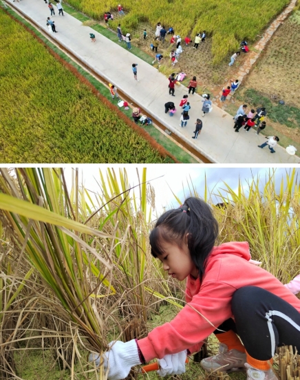 11月12日,市政集團(tuán)建設(shè)的龍州濕地水稻田迎來了豐收季,藍(lán)天白云倒影在清澈見底的湖面,伴隨著五彩繽紛的波斯菊花海搖曳生姿,金黃色的稻谷在秋風(fēng)中散發(fā)著陣陣稻香...城市的繁華與美不勝收的風(fēng)景和諧共生的畫面,吸引了來自龍巖中心城區(qū)中小學(xué)生、家長及眾多市民前來參觀、體驗。學(xué)生們利用假期走進(jìn)田間課堂,真切體會了龍巖“新晉網(wǎng)紅打卡地”的獨特魅力。