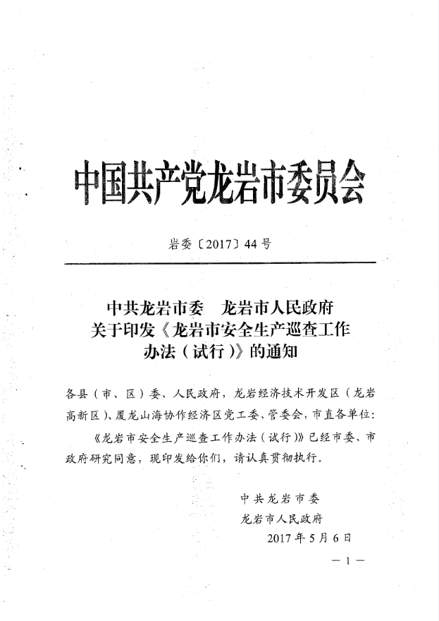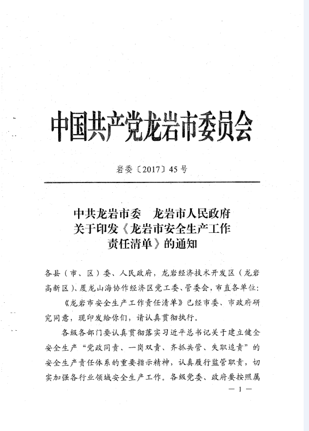 龍巖市安全生產(chǎn)責(zé)任清單及安全生產(chǎn)巡查工作辦法(巖委【2017】45)